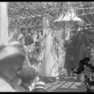 Exterior view of the California State Capitol building during the symbolic "Wedding" of East and West Sacramento Valley. Staged in front of the capitol after the completion the Yolo Causeway in 1916.