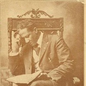 Screened print of a studio portrait of J. Gordon McPherson seated in a chair, reading the Bible. Printed in brown ink on beige card-stock.