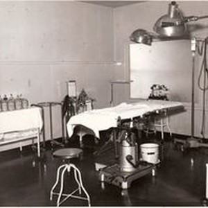 Photo--black and white: Palm Drive Hospital surgery room, about 1940s.