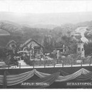 Postcard photo, black and white: A 1911 Gravenstein Apple Show exhibit showing a miniature farm made of apples.