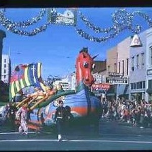 Views of Christmas parade on J Street at the corner of 9th street. This is a view of a ballon type float in the shape of a viking ship. The slide is dated November 26, 1955