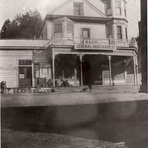 Photo--black and white: W. B. Coy General Merchandise store with home above store in Occidental north of Altamont Hotel. William Bela Coy was a native of Wisconsin. Narrow gauge North Pacific Coast railroad track seen in foreground on what is now present day Bohemian Highway. Main Street Occidental runs in front of store.