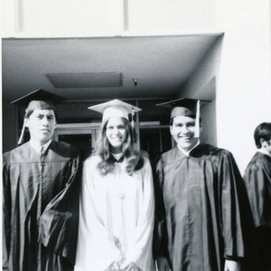 Phillip Martinez (left), Nora Comelli (center) and Tom Martinez (donor) in their caps and gowns on graduation day at Woodrow Wilson Senior High School, El Sereno.