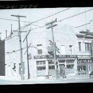 Unidentified street scene in unidentified town; possibly a fraternal lodge building