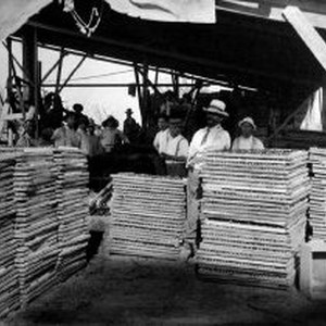 Farm workers drying prunes in crates.