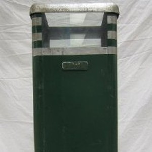 Receptacle likely used for disposing ticket stubs at entrance to the park. Metal receptacle is painted green with silver stripes near top and silver rim around opening at top. Interior is not directly open to the top, but separated two slanted glass panels (one missing). Two other glass panels flank the front and back of the receptacle at the top. Door on backside opens to remove contents. Label, possibly the maufacturer, reads: "Percy, New York." First in a set of two.