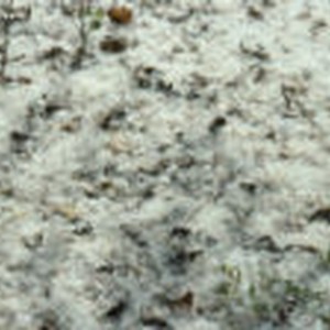 White fuzzy material on ground with leaves and small tree branches sticking through. Slide mount describes as cottonwood fuzz.