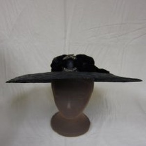 Woman's black straw cartwheel/picture hat with very wide brim and low crown. Black velvet hatband and bow. Elastic band inside crown. "Leslie James" label.