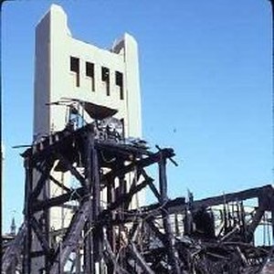 Muni Pier fire with Tower bridge in background.
