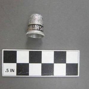 Metal thimble with embossed letters that read "Fuller's Paints"