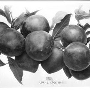 Photo, black and white: Plums on a branch. Caption: "U.U.-6 No. Br)." August, 1929.