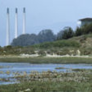 Godwits and Dunlins in foreground with exhaust stacks in background.