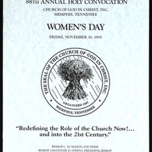 Women's day program, "Redefining the role of the church now!... and into the 21st century", 88th Annual Holy Convocation of the Church of God in Christ, Memphis, Tennessee, 1995 November 10. [Description English/roman)]