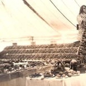 Postcard--black and white photo--Gravenstein Apple Show year unknown. Display is front view of girl mannequin on ladder, both made of whole and dried apples. Sign on girl's back "Miss Sebastopol." Sign on apply display behind ladder "Spring Hill." In background and to left are tables and displays of apples from local areas. See 2648 and 2650 related postcard.