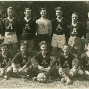 Men's soccer team, Sacramento Acorns of Oak Park, poses in uniform with coach wearing suit. Standing, far right is Nicholas Rohrer.