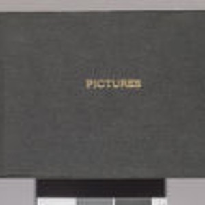 Bound in black textured material. The title "Pictures" is embossed in the center of cover in gold lettering. The number "77" is affixed to the top of spine with glue. Images are clippings and reproductions of artworks and illustrations, some postcards, and other mementos. Light wear on surface and along edges. Moderate wear at edges of spine. Pages 76-98 are blank.
