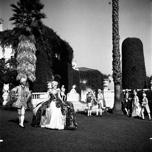 Label accompanying photograph in album reads "HEH 43 Art Gallery terrace and lawn, looking east, with figures." Another copy of this image has MS notes identifying the couple on the left as Bob Wright and Beverly Wallace (Bartell), and the woman on the terrace in the white dress with broad panniers as Martha Shaw.