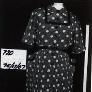 Woman's brown, black and white print dress (a) and belt (b). Rayon and jersey. Brown background with off-white and black designs. a) Dress--Collar, center front, eleven black plastic button closure. Shoulder pads. Elbow length set-in sleeves with cuff. Black grosgrain ribbon trims a mock front yoke and two pocket flaps. At side seam at waistline are two crocheted belt loops. Pockets at hipline. Tucks are take across wrist and released below pockets, makes a pleated skirt. Label "Larry Aldrich, New York" b) Belt--black