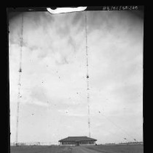 SERIES. Views of transmitter building and towers with long straight road leading to it. Fields on either side on either side of road.