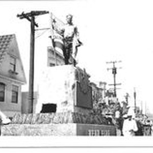 Photo--black and white: William S. "Bill" Borba on Bear Flag Float circa 1940s during a parade, possibly in San Francisco. Borba stands high on a "rock" holding the California Bear Flag. An unidentified emblem is on the side of the "rock." Borba wore Captain "Boss" Meeker's boots that are now are in the possession of the Western Sonoma County Historical Society.