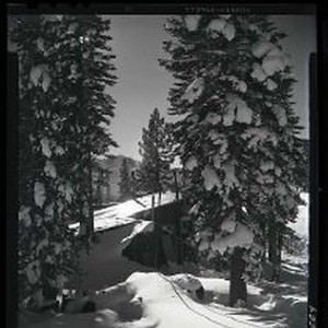 Snow scene: house & trees, ca.1950