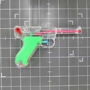 Clear plastic water pistol with green grip and blue trigger. Made in China.