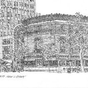 Original pen and ink drawing of Sacramento Main Library in Sacramento