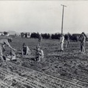 Farming on Whitsett property. William P. Whitsett standing on far right. Two men kneeling. One man standing by box. Four men standing with hoes.