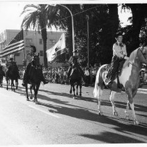 View of the parade down K Street between 6th and 7th Streets looking east. Part of the "re-run" of the Pony Express during the centennial commemoration in 1960. This view shows an unidentified mounted unit.