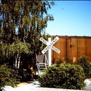 Slide, color transparency: The Pacific Fruit Express railroad car on the property of West County Museum at 261 South Main Street in Sebastopol. The boxcar is used by the Museum for archive storage.