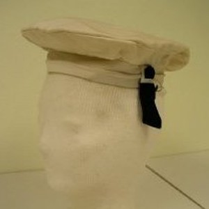 Child's sailor-style white cotton hat; black velveteen bow and shell buckle; original price tag "1.25"