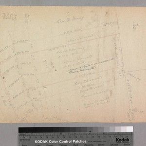 On page 3 of document, "1868 Rancho La Ballona Manuel Valenzuela, Lauriano Talamantes, Macedonio Aguilar as successors to Benina Talamantes, 3rd class land... sold to Albert Eldred..." Shows courses, distances, parcel owners, stations. Title supplied by cataloger.