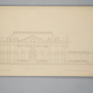 Elevation drawing of a proposed design for the Huntington residence. This design was not chosen. Notes read