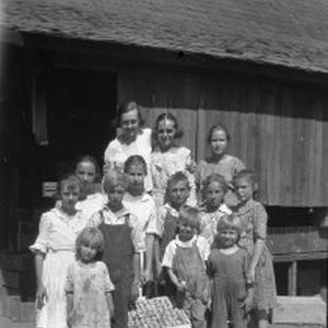 Group of children posing with a Pacific Fruit Exchange wooden box full of plums at Crocker Ranch in Loomis, California. From the notes written by Alma Senia Nassi Larsen attached to the negatives: "Packing at Crocker Ranch We camped at the Crocker Ranch 1921 after 3 years working for Rudolph Nixon and Frae Denton. Nixon would come get us each morning and bring us back home at night or after work. We rode in his Hudson Super Six - Nixon used to tell us his brother willed him $200 a month as long as he lived. We had a lot of experiences at Nixon ranch learning how to pack, etc. But we thought the Crocker Ranch would be more super. Close to the American River. We had our tent to sleep in, an awning put up for our kitchen and we had brought all the stuff from home. Every nite we'd take off to the RIver for a swim. At that time they were hydraulicking up in the hills and the river was red water. I almost drowned the 1st time we went down there. Jenny was going to teach me to swim and we got in a deep hole and I went down and grabbed Jenny and we both almost got it; as I got up I held my hand out Maiela caught it and pulled me out. I owe my life to her. It was a close call. Jenny, Aili, Mait, Rachel, Ino, Kitra, me workd for Crocker. Wallen's also were camped there - and there were the Carters (Rose his wife) - he later was Loomis Constable - and Carter's brother and family, 2 girls and a boy and Helen. I drew Ritchie's picture and its in my scrapbook. He threw a soft peach at it. Also we sent another one to the Earl - never heard how he liket it - but old Mrs. Crocker did. She was a Mormon. Her sister lived next door and across the street from Mas in Rocklin."