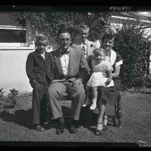 An unidentified family consiting of a man, woman, two boys and a girl posed seated in a backyard.