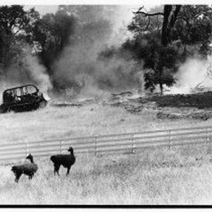 Two llamas look through a wooden fence at a bulldozer fighting a grass and brush fire.