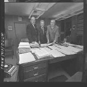 Group - Three men looking over documents on desktop.