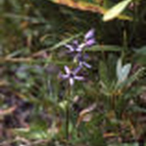 Five-petaled purple flowers on green stem.