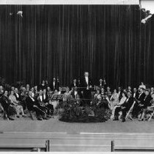 Panorama of the Sacramento Municipal Orchestra on stage at the Municipal Auditorium. Franz Dicks, conductor, posed in center.