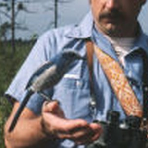 Close up of Professor Oglesby holding a Florida scrub jay.