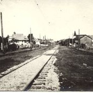 Photo--black and white: The P&SR railway tracks in Sebastopol, 1904. Looking north toward town, this photo was taken from about the location of the Colombo Lumber Yard. The lumberyard was located on South Main Street at Palm Avenue. The steeple of the Congregational Church is seen in the right background which was located next to the P&SR depot.