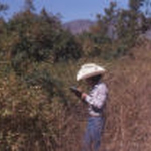 Lab II student Roy Barnes working in field near a Poison Oak plant at Bernard Field Station.