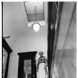 A 1915 lamp shines on Colusa County Clerk Martha Nannen outside the Hall of Records
