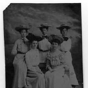 View of five women including the Montfort sisters. They posed with their faces in a cutout.