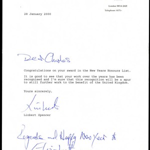 Letter of correspondence from Linbert Spencer to Charles Handy congratulating Handy on his award in the New Years Honours List, January 28, 2000; Charles Handy Papers; Box 13, Folder 24; 1 page