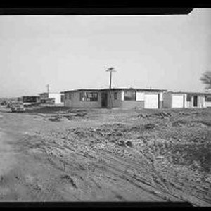 Houses in a housing tract under construction. A sign reads "Model Home 4 bedrooms 2 baths $9000 The Home Featured in Life" Original container marked "East Yolo Record"