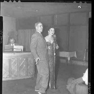 SERIES - Unidentified young woman wearing a sequined dress and an unidentified man ,standing in front of a microphone.