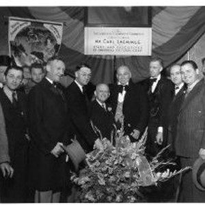Large group of men standing behind large floral arrangement. Banner overhead "Sacramento Chamber of Commerce welcomes Mr. Carl Laemmle and the stars and executives of Universal Pictures Corp". Mr. Laemmle is in center of photograph. Banner to left reads "World Premiere Showing, Alahambra Theater" The motion picture was Sutter's Gold".