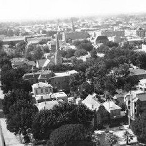 Elevated view of residential neighborhood across from Capitol Park (visible in foreground). View looking west down M Street (Capitol Mall) to the Sacramento River. High resolution scan available.