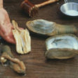 A large saltwater clam is displayed after it is removed from its shell to be prepared for cooking.